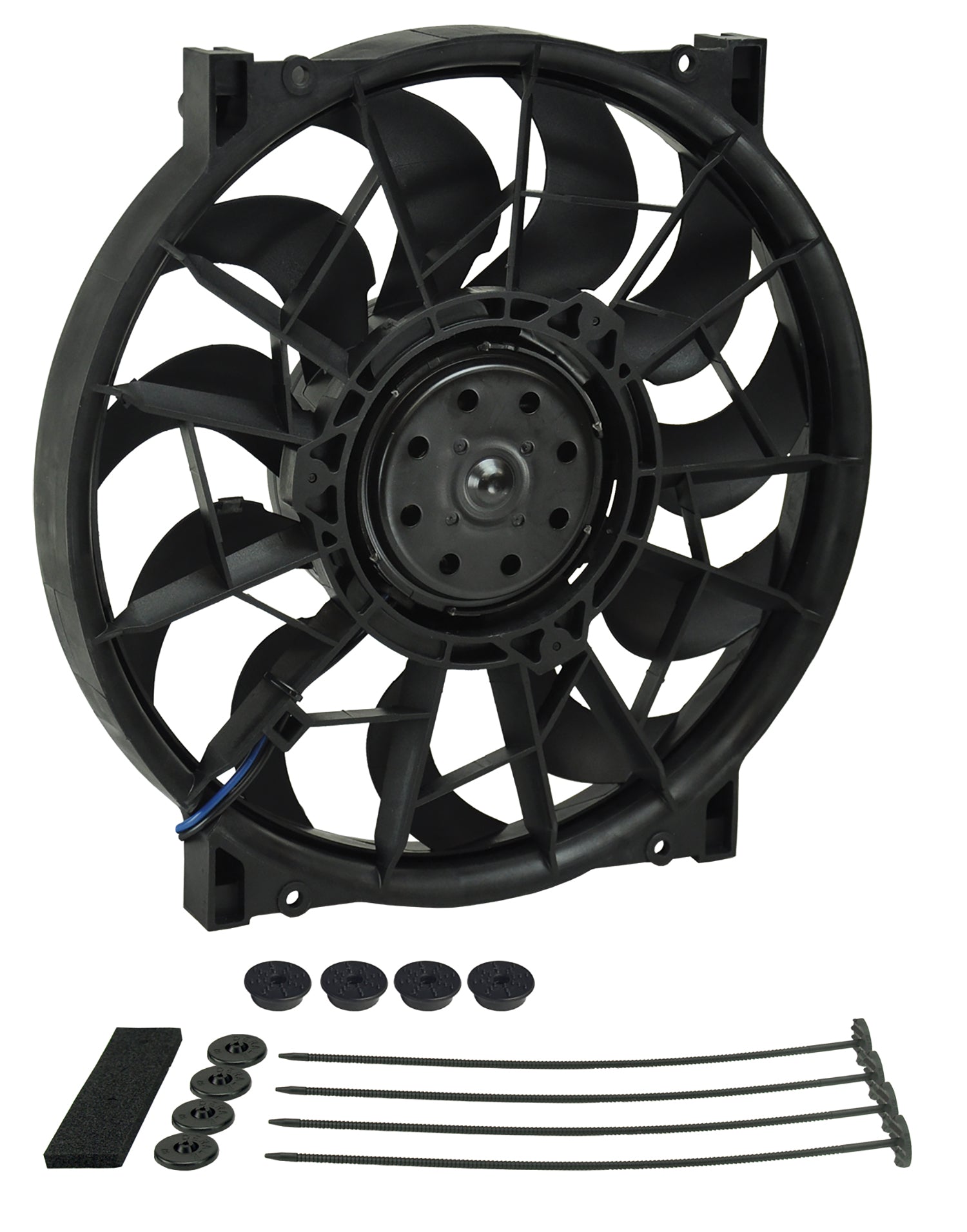 the same 265 watt Bosh motor spinning 11 ultra-quiet patented skewed blades with an injection molded housing and stator flow directors for maximum airflow efficiency. Kit includes high amp relay harness, 4 plastic through-radiator core rods and clips and 4 foam pads. This is the replacement fan for part numbers 16926, 16928 and 16934.
