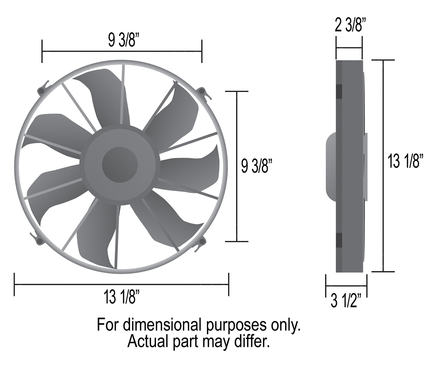 This 12" High Output Single RAD fan is a self-shrouded, symmetrical design with four molded mounting points. Motivated by a 300 watt motor driving 7 skewed blades, it can be used as a pusher with the supplied hardware kit. Fan can also be used as puller by combining with a custom built shroud. Moves 2000 CFM while drawing up to 24.8 amps.