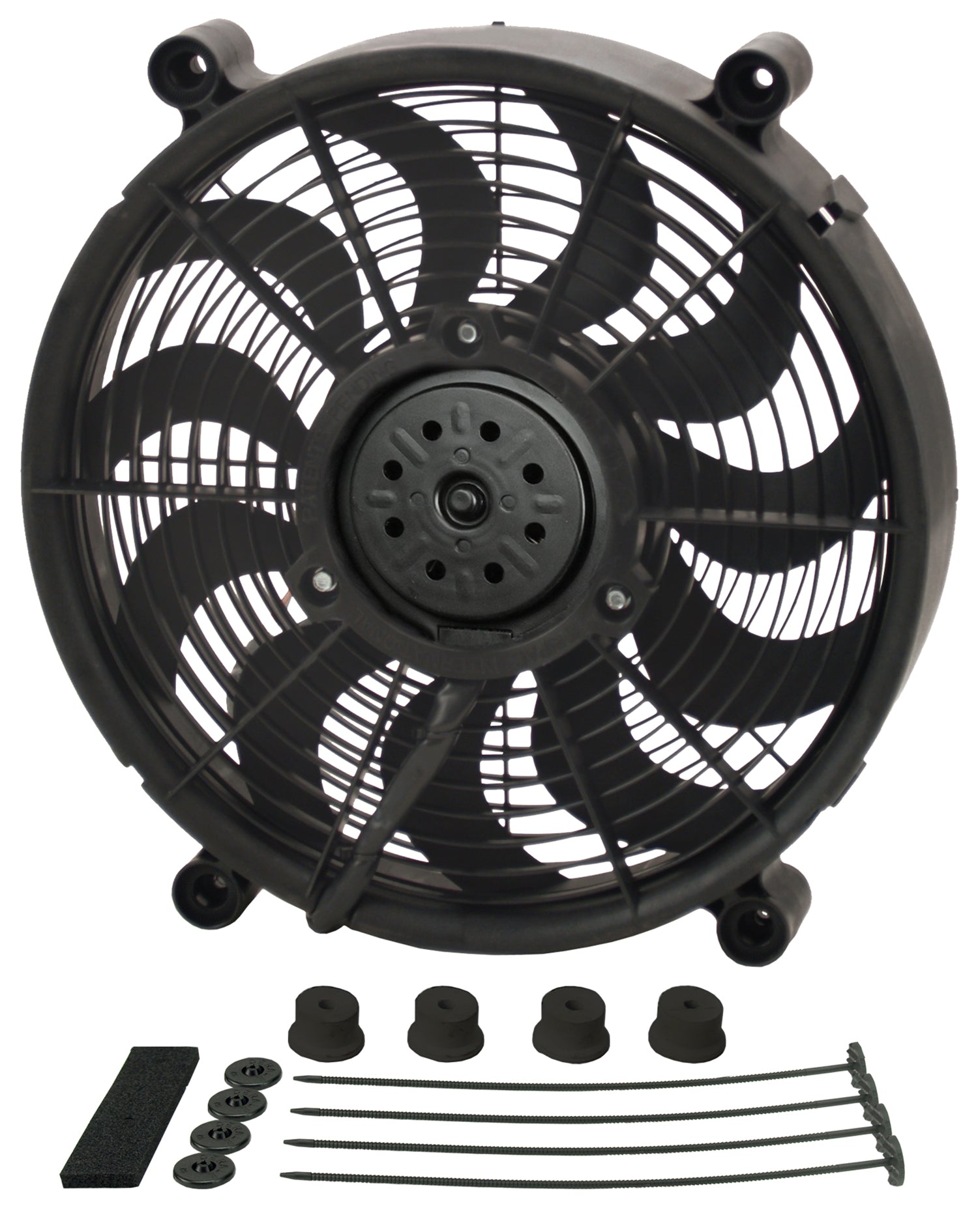 A very popular primary cooling fan, this 14" High Output Single RAD fan is a self-shrouded, symmetrical design with four molded mounting points. Motivated by a 2-speed 265 watt Bosch motor driving 11 patented skewed blades, it can be used as a pusher or puller fan by simply flipping brackets without changing direction of the unit. Moves up to 2100 CFM while drawing up to 22 amps.