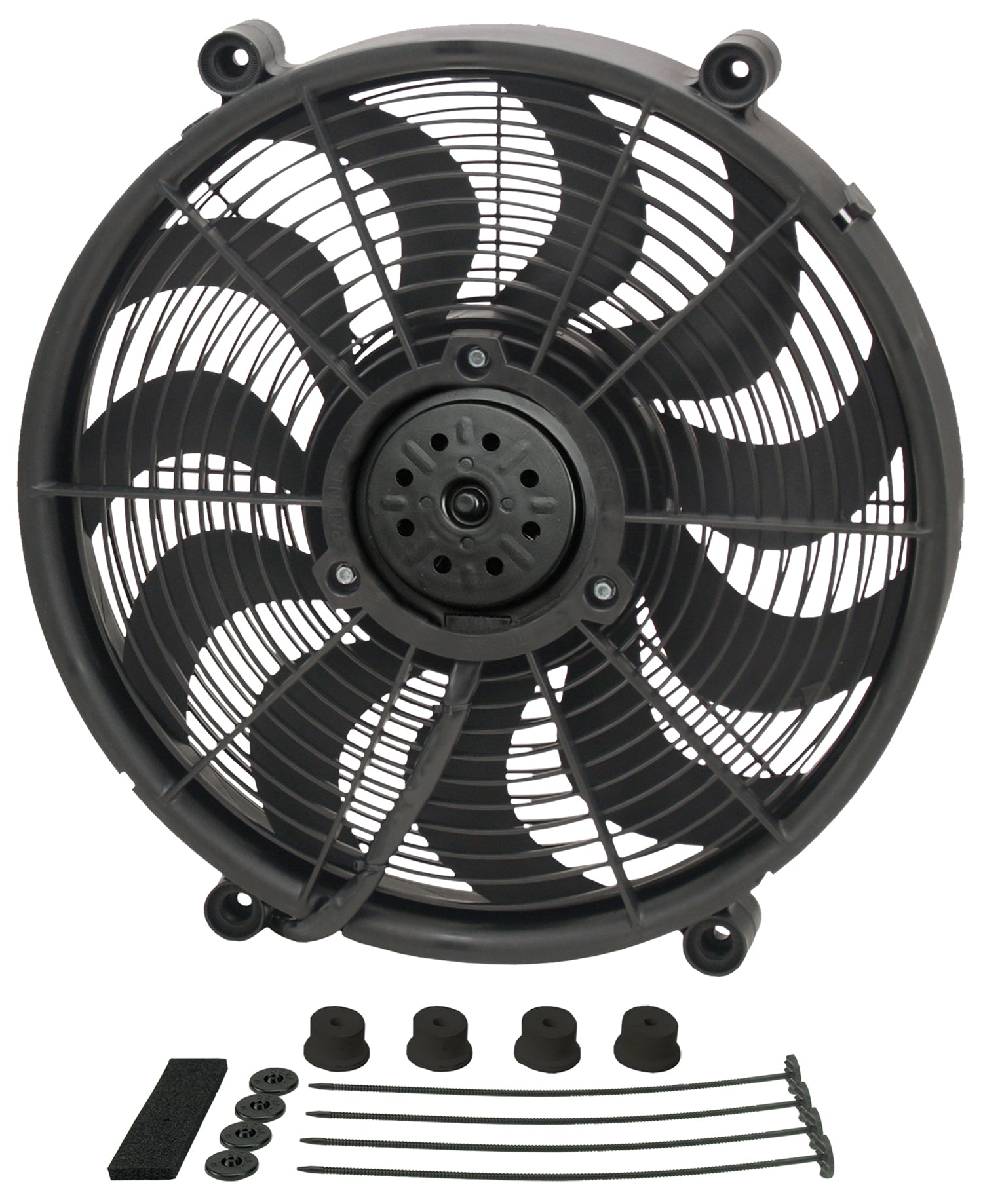 Our most popular, this 17" High Output Single RAD fan is a self-shrouded, symmetrical design with four molded mounting points. Motivated by a 2-speed 265 watt Bosch motor driving 11 patented skewed blades, it can be used as a pusher or puller fan by simply flipping brackets without changing direction of the unit. Moves up to 2400 CFM while drawing up to 23.5 amps.