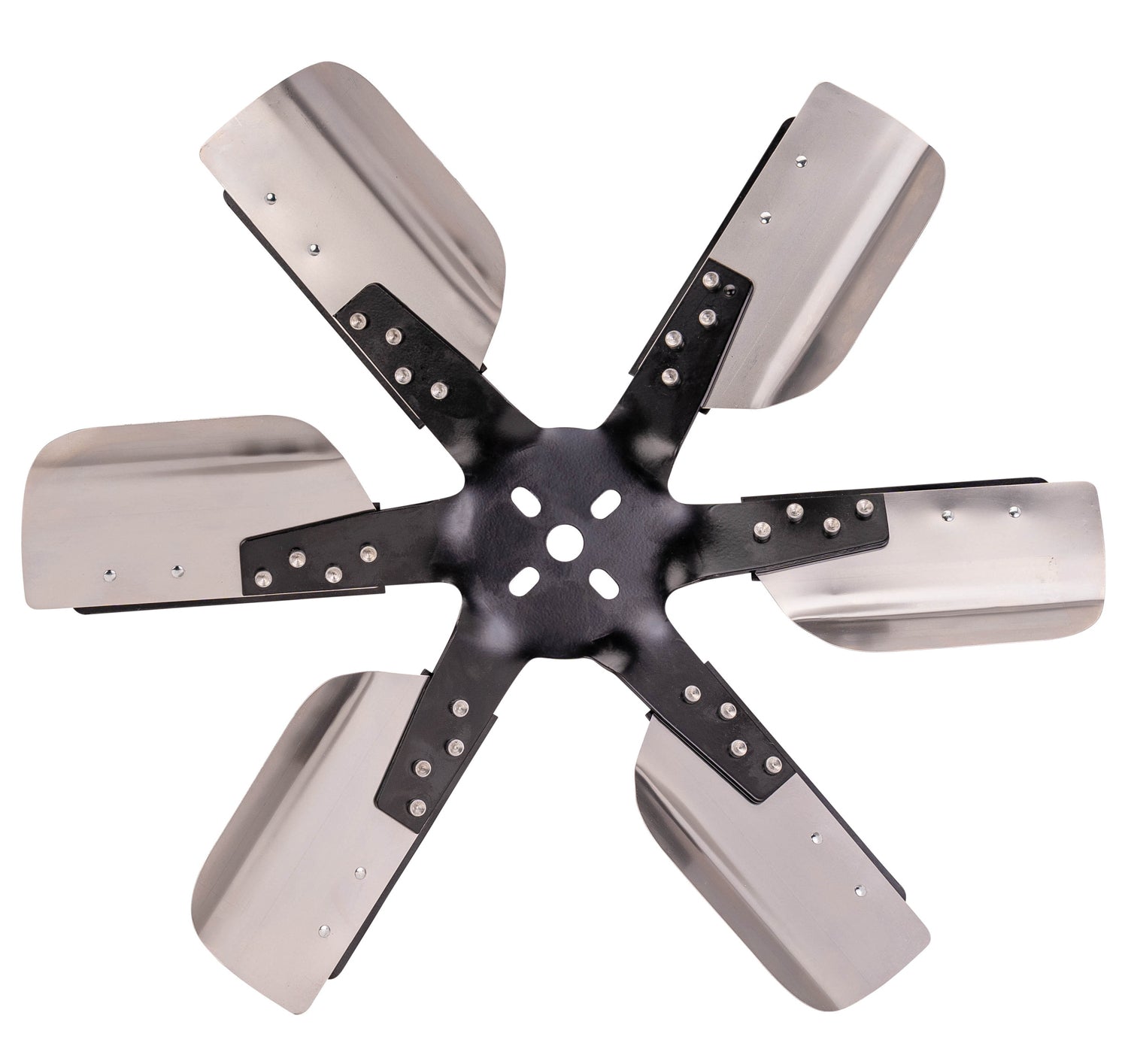 Our 19" heavy duty standard rotation fan features thick black steel hubs and 6 stainless reinforced blades with a large surface area that improve performance and fuel economy and is rated up to 10,000 rpm. The large surface area of the blades pull more air at lower speeds than other flex fans.