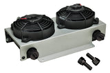 This compact yet powerful Hyper-Cool Dual Cool Remote Cooler adds a great deal of flexibility and cooling options to enthusiasts everywhere. This efficient little workhorse is perfect for engine, transmission or power steering needs. Utilizing a high-performance 19-Row Stack Plate Cooler with integrated turbulators and airflow supplied by two 5" waterproof/dustproof electric fans, it can literally be mounted anywhere space permits. Add the clever anodized aluminum dual shroud that doubles as the mounting bracket, this cooler is equally efficient regardless of orientation. It can be mounted upside down, vertically, horizontally or diagonally, and that flexibility makes it truly unique in the remote cooler category. Every kit includes two -6AN male fittings, two 3/8" barb fittings.