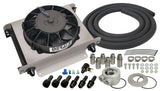 With its own air supply, this new remote cooler can literally be mounted almost anywhere, making it a popular addition for performance cars, hot rods, muscle cars and trucks. Featuring our top of the line aluminum 25-row Stacked Plate cooler coupled with a Tornado fan and aluminum shroud, this universal kit comes with a complete installation kit to install easily on most vehicle engines. Also included is an 180°F in-line thermostat for activating the electric fan. The Hyper-Cool Engine Oil Cooler kit is perfect for applications where space is limited but engine cooling is a necessity.
