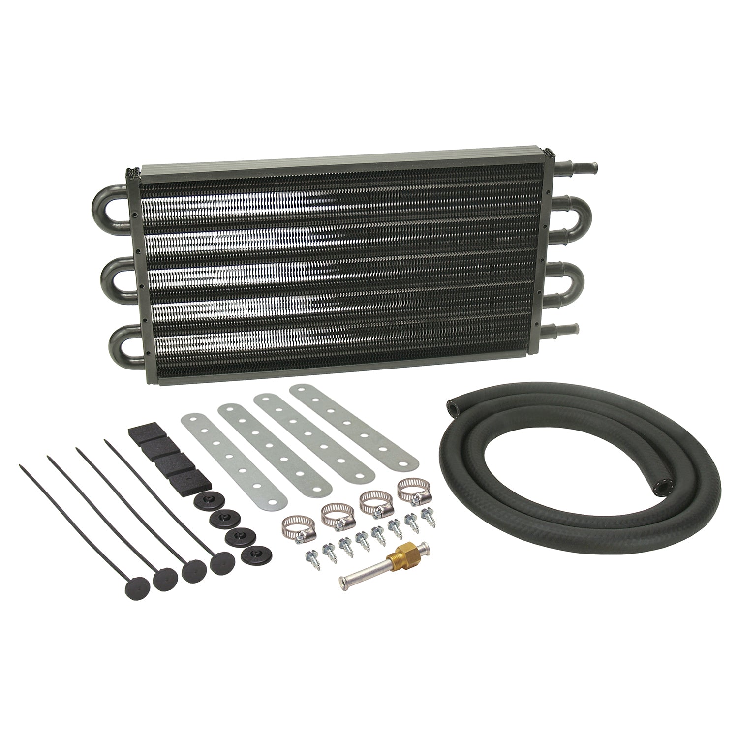 This Tube & Fin transmission cooler features 1/2" copper tubing expanded into aluminum cooling fins and includes embossed turbulators which serve to agitate fluid for maximum heat transfer. Perfect for medium-sized cars and compact trucks and SUVs' that see light duty towing, they improve shifting performance and extend the life of the transmission by eliminating heat-related transmission failures. This kit comes with a complete transmission cooler hardware kit to easily install onto vehicles with 5/16" transmission cooler lines.