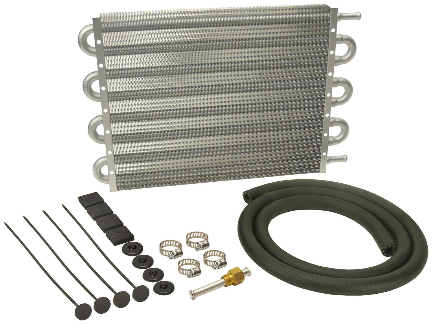 This universal all-aluminum transmission cooler is perfect for today's full-size car and truck automatic transmissions. Featuring embossed turbulators inserted into full 1/2" tubing to agitate fluid and louvered cooling fins, it extends transmission life by helping to prevent heat-related transmission failures while improving shift performance. This kit comes with a complete transmission cooler hardware kit to easily install onto vehicles with 5/16" transmission cooler lines.