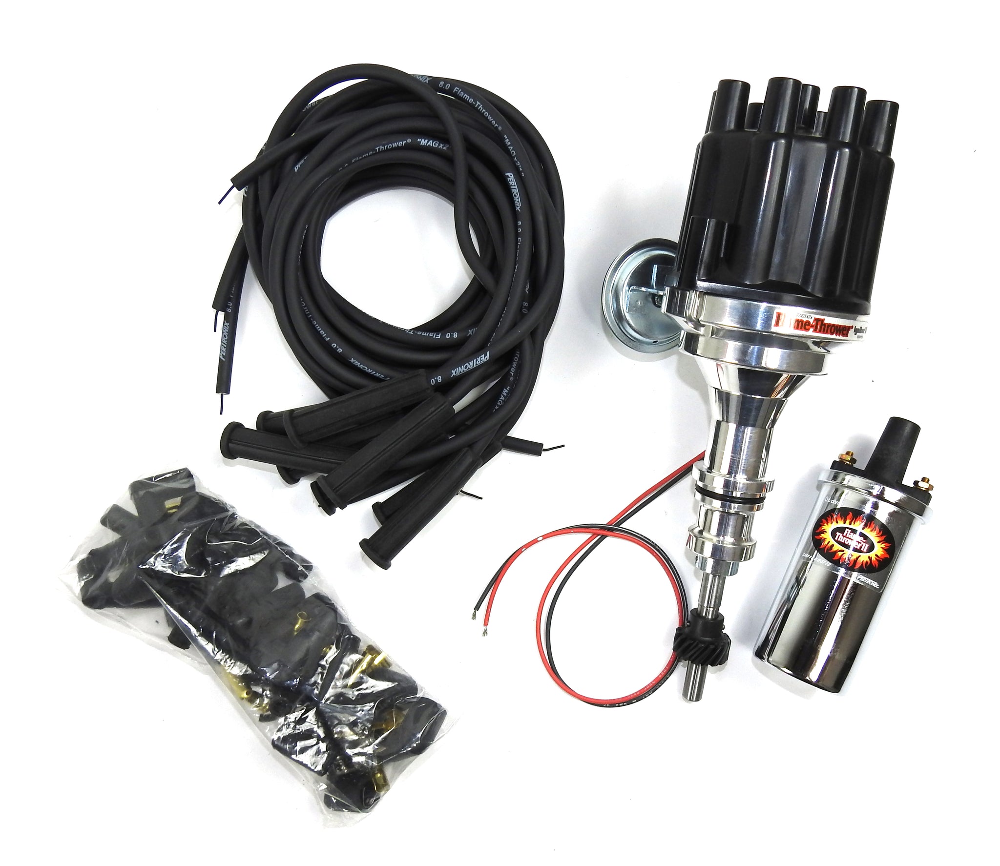 Going to a complete PerTronix ignition system will improve your performance with more horsepower and better throttle response. PerTronix Ignition makes it easy including everything you need that has been engineered to perform at its best in one box. These bundles include a Flame-Thrower Billet Plug n’ Play distributor with Ignitor II or Ignitor III module technology, a matching low resistance FlameThrower chrome coil topped off with a set of Flame-Thrower 8mm MAGx2 universal wires featuring silicone jackets to resist high temperatures. Bundles are available for the most popular Chevrolet and Ford engines as well as Chevrolet Marine. (Bundles include parts covered under C.A.R.B. E.O.’s: Distributor #D-57- 23 & Coil #D-57-21)