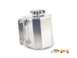 Size: 6" Tall, 4-1/2" Wide, 4-1/2" Deep. Tank: 1.75 qt. tank. Side Port: 1/4" N.P.T. Bottom Port: 1/4" N.P.T. Comes with clear tube sight gauge, integrated mounting flanges, and in addition to the petcock & vented cap, two 5/16" barbed fittings 1X 90 deg. & 1X straight.