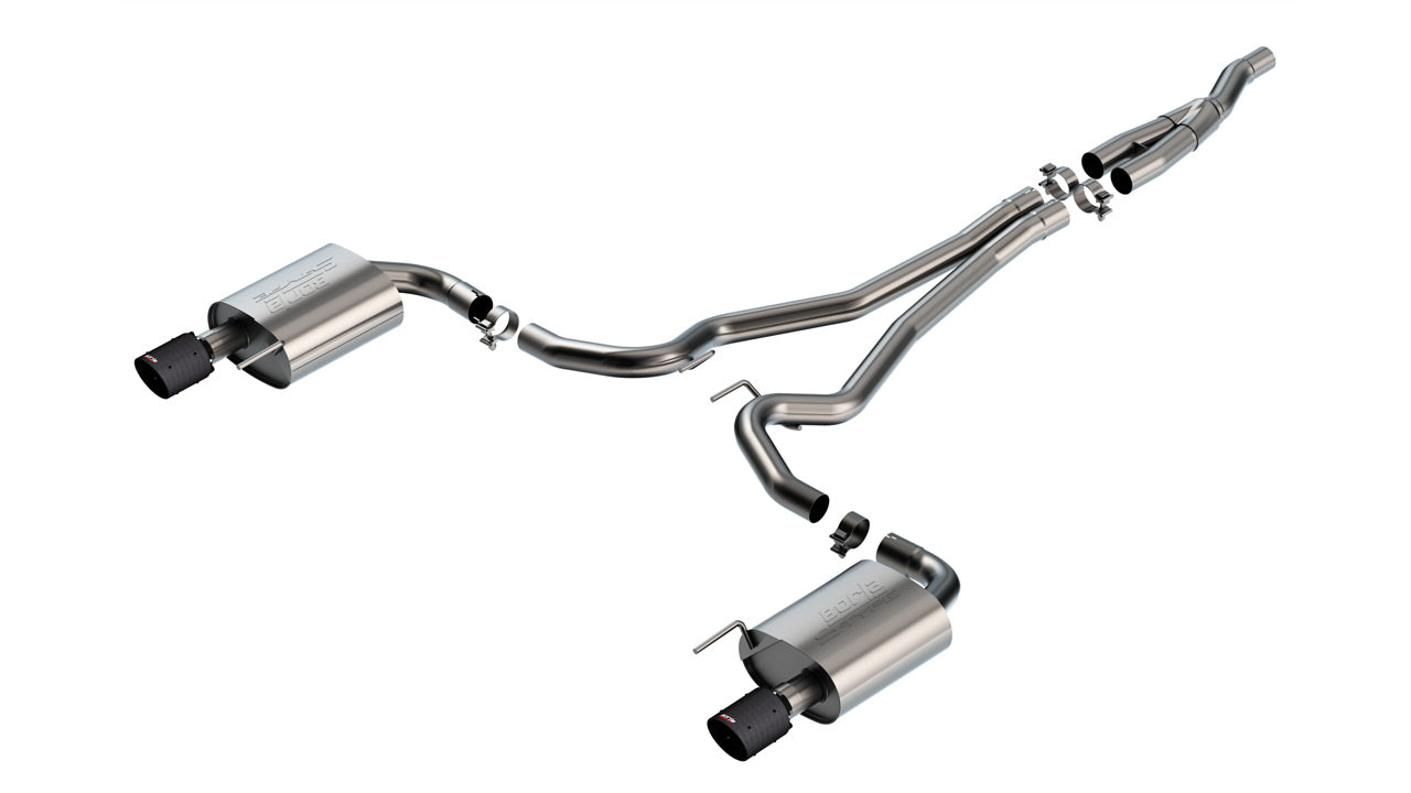 This 2.5" diameter BORLA Cat-Back system is designed for use on EcoBoost cars WITHOUT the Active Exhaust feature. It features the classic S-Type sound with no drone inside the vehicle and single 4" round carbon fiber with black anodized center tips on each muffler assembly. Systems with bright chrome on T-304 stainless steel, and black chrome on T-304 stainless steel tips are also available. BORLA Cat-Back and Axle-Back exhaust systems feature patented straight-through and multi-core technology designed to unleash hidden horsepower. Increased exhaust velocity adds power, driving excitement, fuel economy, and the distinctive BORLA Sound of Power respected by motoring enthusiasts everywhere. Each system is built from premium T-304 stainless steel, superior to T-400 series knockoffs (such as 409), to give you the absolute best in performance and durability. Ultra-smooth mandrel bends ensure maximum flow & power, and precision computer numerical control (CNC) manufacturing ensures an accurate fit. Best of all, BORLA stands behind every system with a Million-Mile Warranty. Just what you'd expect from the world's most experienced (and most winning) exhaust brand.