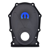 Give your Big Block MOPAR some love with this factory replacement heavy gauge steel timing chain cover. Black crinkle finish, with recessed Mopar Emblem with blue inlaid paint! Matching black bolt-on timing tab included, and factory crankshaft seal pre-installed.