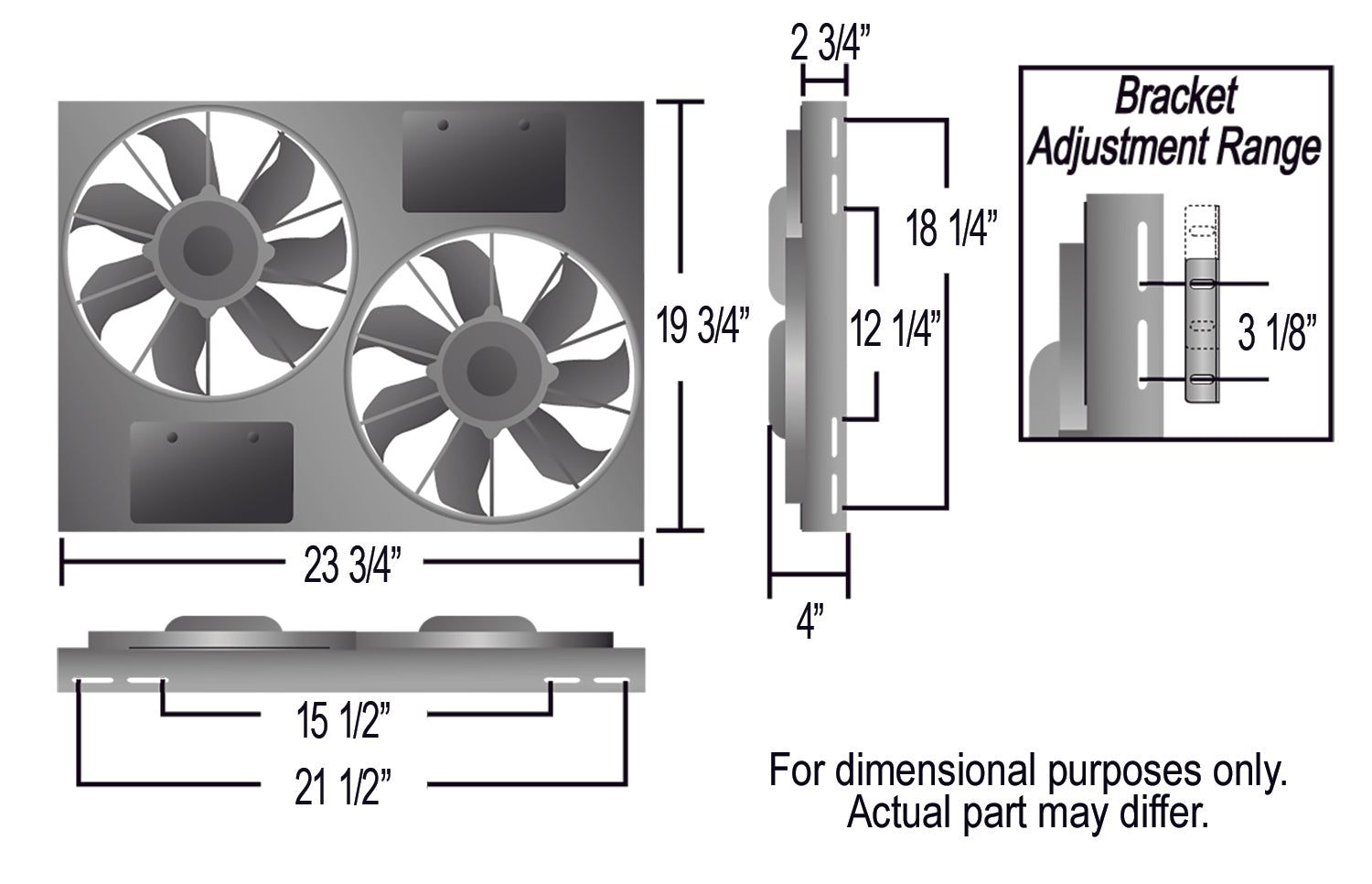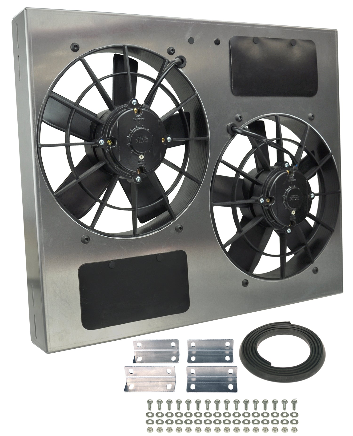 This Dual High Output RAD Fan Powerpack Assembly allows true Dual Fan performance in a package the size of others Single shrouded fans. Featuring an aluminum shroud measuring a tidy 23 3/4" wide by 19 3/4" top to bottom and only 4 1/2" in overall depth to offer an adjustable yet precision fit, it uses two IP-68 certified waterproof/dustproof 11" electric fans to provide a powerful one-two 3750 cfm punch to a hot engine. The natural, non-finished aluminum shroud gives the user the freedom to polish, anodize, paint, or simply leave it raw to create a truly custom look at a reasonable price.