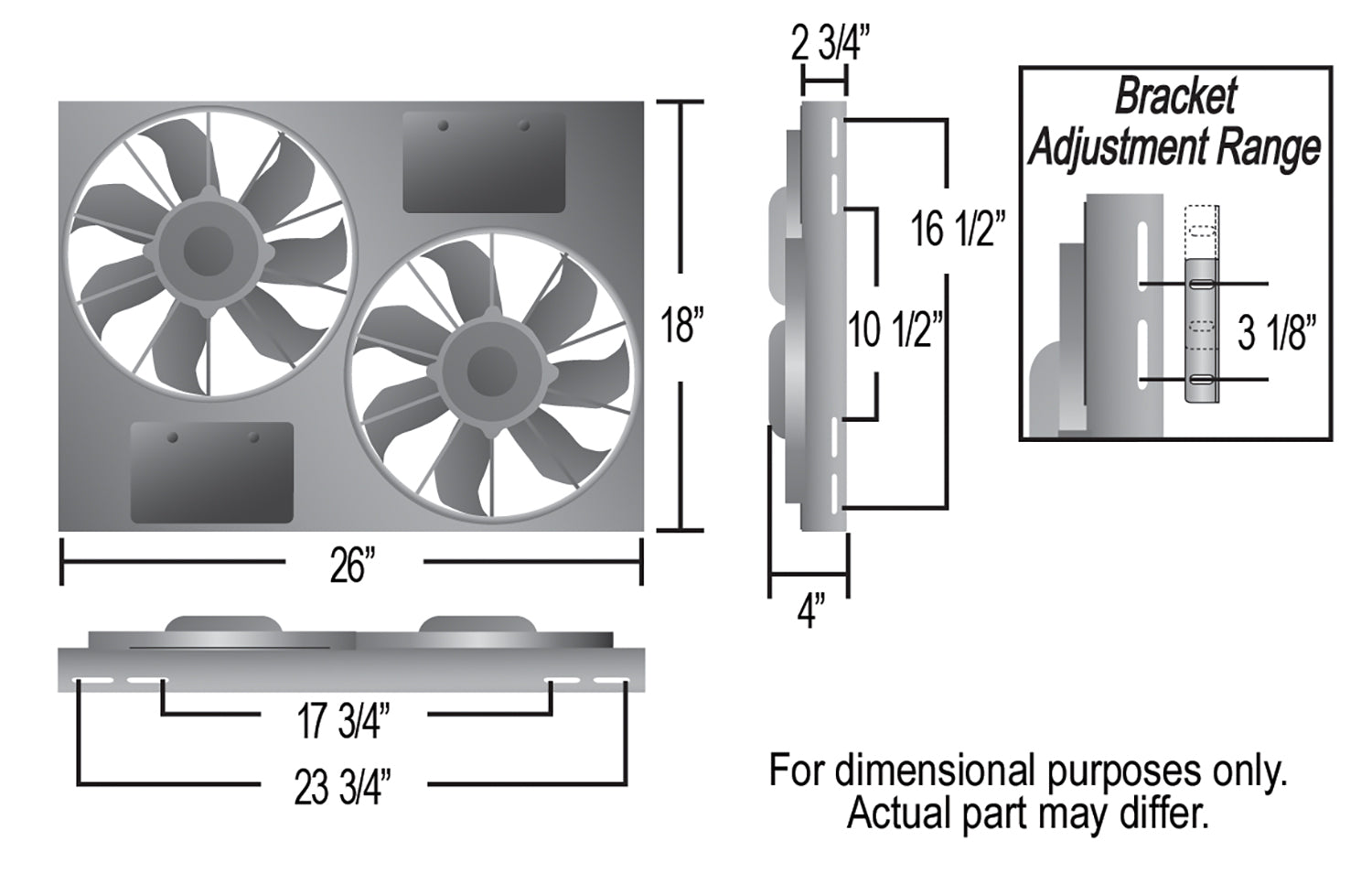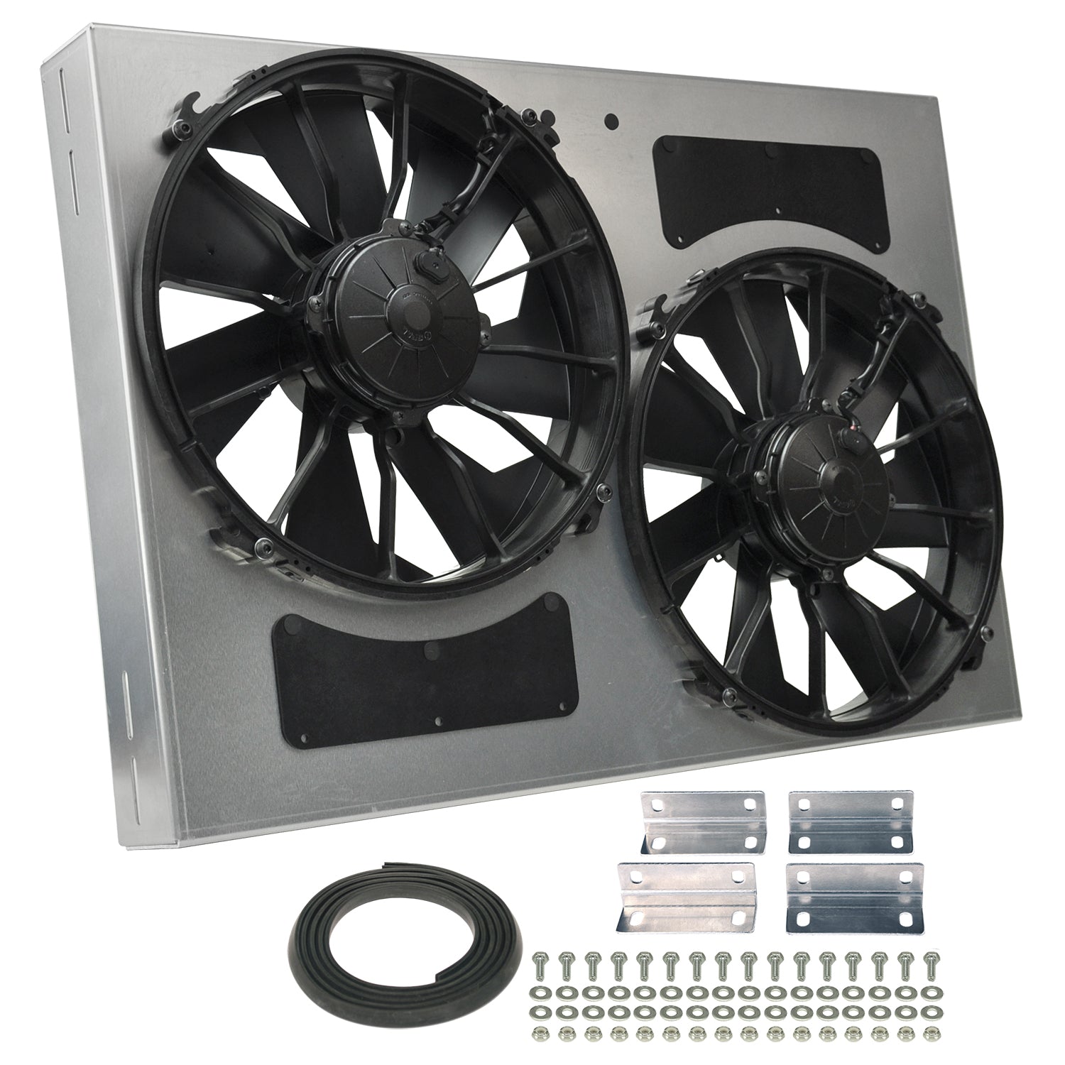 This Dual High Output RAD Fan Powerpack Assembly is part of the HO Aluminum Shrouded Fan Series that is designed with the application in mind. Based on some of the most common radiator core sizes sold today, this unit features an aluminum shroud measuring 26" wide by 18" top to bottom and is only 4" in overall depth to offer an adjustable yet precision fit. The natural, non-finished aluminum shroud gives the user the freedom to polish, anodize, paint, or simply leave it raw to create a truly custom look for an affordable price. The dual 12" high output electric fans are some of the most proven and reliable fans in our line-up. Offering a total of 4000 CFM, this dual electric fan assembly generates the most real-world airflow in the smallest package on the market.
