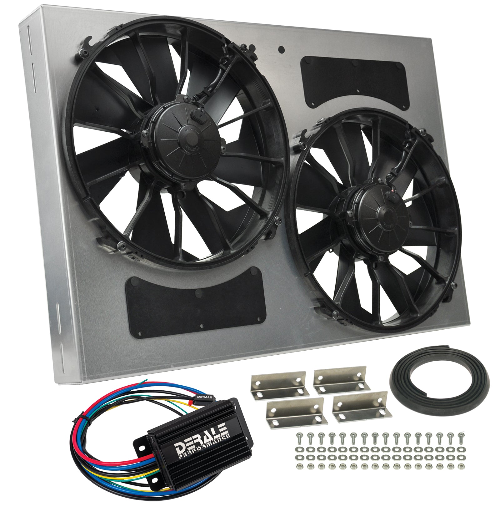 Get complete control of your engine temperature! Derale Performance has combined their high-performing shrouded Powerpacks with the ultimate fan controller. Using high output electric fans incorporated into an engineered shroud, this Powerpack can conquer even the most difficult cooling conditions. This unit features an aluminum shroud measuring 26" wide by 18" top to bottom and is only 4" in overall depth to offer an adjustable yet precision fit. The natural, non-finished aluminum shroud gives the user the freedom to polish, anodize, paint, or simply leave it raw to create a truly custom look for an affordable price. The dual 12" high output electric fans are some of the most proven and reliable fans in our line-up and are specifically designed to thrive on thick, tight fin radiator cores. Offering a total of 4000 CFM, this dual electric fan assembly generates the most real-world airflow in the smallest package on the market. Now add the PWM Fan Controller with built-in soft start technology. The controller utilizes Pulse Width Modulation to constantly adjust electric fan speeds from 0-100%, maintaining the optimal engine operating temperature. No more reacting to the engine temps, you can control it! This allows electric fans to operate at the percentage needed, instead of 100% all the time, therefore increasing component life and eliminating amperage spikes.