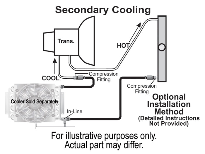 This kit includes everything you need to install a remote transmission cooler. Kit includes a 180° F in-line thermostat & 3/8"compression fittings to install onto all vehicles with 3/8" transmission cooler lines. Although it is made to work with Derale's popular remote mount coolers, there is no reason why it wouldn't work with competitor models as well.